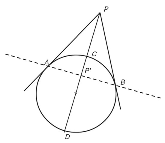 Crucially, an early instance of a geometric construction of the harmonic cross-ratio would appear within Apollonius’s Conics (Apollonius of Perga 2000). Thus, in Book I, Proposition 34, a construction is described in which a line is drawn from a point P passing through a circle (or an ellipse or a parabola) as its diameter and cutting the circumference at points C and D, as below in Figure 7. If a perpendicular drawn to that line cuts it at point P′ so as to form a harmonic cross-ratio, PD:DC::DP′:P′C, then straight lines drawn from P to points A and B where the perpendicular cuts the circumference will touch the circle as tangents.30 This generalization of the musical tetraktys, it is clear, is closely related to the construction of the pole and its inverse with respect to a circle.