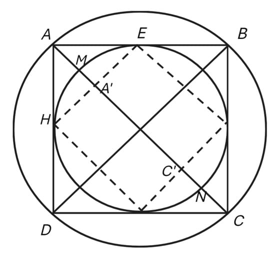 Returning to our polygonal simplifications of Kepler’s nested Platonic solids, were we now to construct diagonals through the corners of the outer square in Figure 8 below such that they transect the circumference of its inner circle (as AC transects it at points M and N) and transect the sides of the inner square (as AC transects HE A′), it can be appreciated how deeply the harmonic cross-ratio is implicit within the relation of the two concentric circles that circumscribe their respective squares31 and, by extension, how deeply it is embedded into the three dimensional equivalents of such two-dimensional structures, the nested dual polyhedra of Kepler’s model.