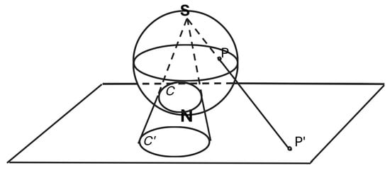 Figure 9. Stereographic projection through the south pole onto a plane through the north pole. Points map onto points, as in P to P′, and circles map onto circles, as in C to C′.