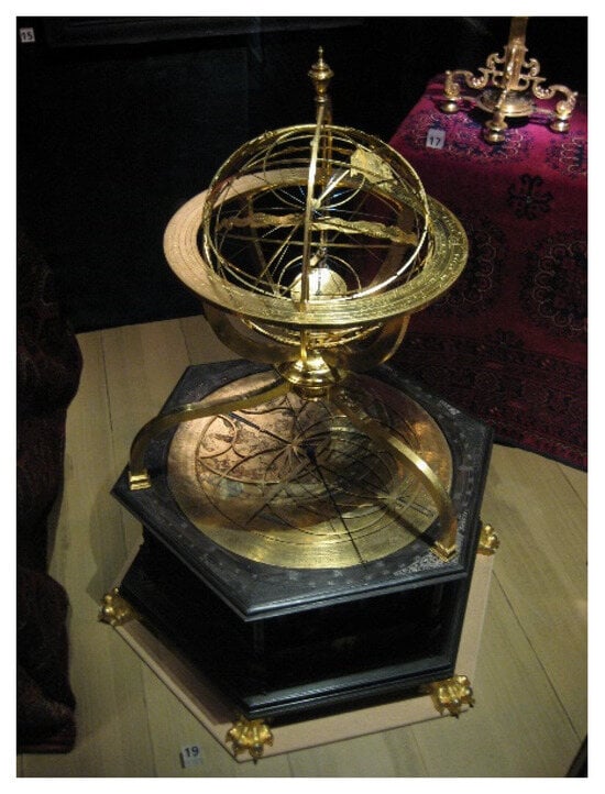 In the last quarter of the century, Tycho Brahe would be able to take advantage of this great development of instrumentation. Having been given control of an island, Hven, located between Denmark and Sweden, he had there established a castle/laboratory filled with such types of instruments, often designed by himself and capable of measuring angles with unprecedented accuracy (Timberlake and Wallace 2019, p. 154).46 After the death of his patron, the King of Denmark, Tycho would relocate to Prague, where he would soon be joined by Kepler. The patron there of both Tycho and Kepler was the Holy Roman Emperor Rudolf II, being said to have possessed eight astrolabes. Figure 10 below shows an instrument combining an armillary sphere at the top with an astrolabe below, constructed by the Swiss watchmaker, Jost Bürgi, who had worked with both Tycho in Hven and Kepler in Prague. This instrument, currently located in the Nordiska Museet in Stockholm, is described as having been used by Kepler.