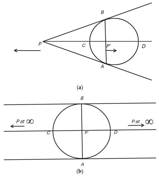 Figure 11. (a). A pole P and its inversion P′ with P moving to the left and P′ to the right. (b) Pole P at “point at infinity”, with its inversion P′ at the centre of the circle. Note, the point at infinity is located equally to the right as to the left.