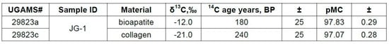 - Brock, F., V. Geoghegan, B. Thomas, K. Jurkschat, and T. F. G. Higham. 2013. Analysis of Bone “Collagen” Extraction Products for Radiocarbon Dating. Radiocarbon 55: 445–63. [Google Scholar] [CrossRef]
