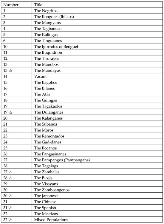 These photographs were an important tool in the elaboration of a detailed racialized and hierarchical taxonomy of the population, which is reflected in the organizational schemes of Worcester’s various versions of the catalogues of these photographs.6 As Rice (2014, pp. 34–35) has shown, these lists were not completely concordant in their numeration, but their general racist logic was consistent. It intersected with religious discrimination—90% of the photographs were taken of what he labelled as Non-Christian groups. The original list consisted of thirty-six hierarchized categories, with a series of numbers not being filled. In a 1902 and 1905 Index and in the Archive of the University of Michigan of Ann Arbor, where most of the negatives of Worcester are preserved, the group he called “Negritos” was always labelled as belonging to the lowest category, no. 1, since he felt them to be the less civilized. Quite surprisingly, mestizos (numbered 31) and “mixed populations” (numbered 32) had the highest numbers and were, therefore, located at top of this hierarchy (Rice 2014, p. 29). In the Index of photographic positives, which Worcester sold to Küppers-Loosen and that are preserved in the RJM, mestizos and “mixed populations” were both numbered 32—cf. Figure 2. They come after the Japanese (number 30) and the Chinese as well as the Spanish who share number 31. “Pure Americans” and “American Mestizos” are nowhere to be found in this list, but individual U.S. citizens are occasionally listed with their names and are photographed—but not as anthropometric types. This in spite of the fact that the descendants of U.S. Americans and Filipinas, the “American Mestizos” were displayed in this period in type-like photographs, as Trajano Molnar (2017, pp. 87–93) has shown.