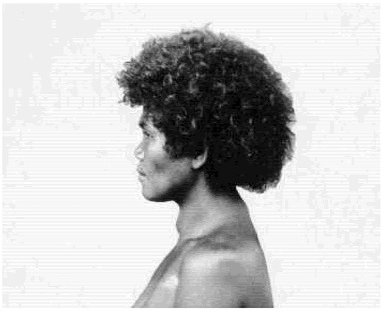 The first image (cf. Figure 3) carries the inventory number 5806 in the RJM, but it also has an original number from the Index elaborated by Worcester/the Bureau of Science, which is 1b68. The number one attributes it to the “Negritos”/Aetas-series, which occupied the lowest echelon in Worcester’s taxonomy. The letter “b” is a geographic indication, referring to the province Zambales on the main Island Luzón. The number 68 results from the numeration of the photographs in this series. The representation of those “Negritos” categorized as being of “mixed blood” does not differ from the depiction of “Negritos” categorized by Worcester and his crew as “pure”. Everything labelled by him as “Negrito woman of mixed blood” (Worcester n.d., p. 114) (“Negrito-Weib. Mischblut” in the German caption) tells us about Worcester’s depreciation for this group—from the derogatory name “Negrito” instead of Aeta to the “half length side view” (Worcester n.d., p. 114), which was used for anthropometric measurements to the relatively short curly hair. None of the mestizos categorized as more civilized in the series 32 is photographed in this position nor are they depicted with bare breasts, an element of eroticization typical in colonial contexts, which has already been pointed out for Worcester’s work (Rohde-Enslin 1999, pp. 238, 287–90; Rice 2011, 2014) and which I deliberately omitted here by cropping the image. Also in the longer texts about the “Negritos” in the Index and in his publications, Worcester makes his contempt for the “Negritos” clear (Worcester n.d., pp. 88–143). This contempt is also evident in Worcester’s description of the Aetas in his 1914 book The Philippines, Past and Present: “They seem to be incapable of any considerable progress and cannot be civilized. Intellectually they stand close to the bottom of the human series” (Worcester 1914, p. 532).