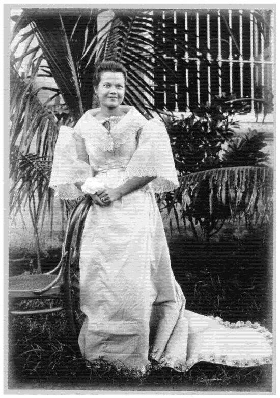 The picture of the Spanish mestiza by Bourns is similar to a photograph by the contemporary Filipino photographer Felix Laureano entitled “la mestiza” published at the end of the Spanish colonial period (Laureano 1895, p. 106)11 and the sketch shown above of a Spanish mestiza by Jagor (1873, p. 184); the latter yet again showing similarities between German and U.S. depictions of the inhabitants of the Philippines. We also see a similarity in the attire of these women. This type of dress was indeed worn by many well-to-do mestizas of varying ancestry and can be seen in the fourth photograph (cf. Figure 6 and also (Coo 2019)), in which the woman wears a similar dress but of a dark tone. However, this photograph, which I will analyze in the next part, was not taken by Worcester or his crew.