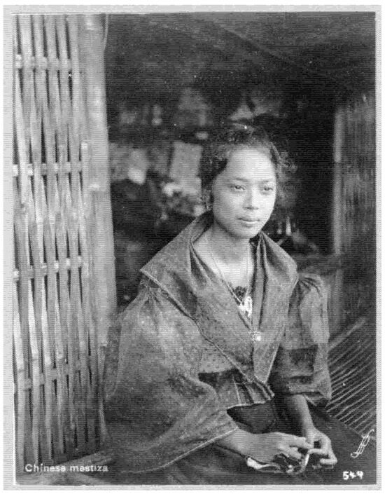 This fourth picture from the collections (here Figure 6) is different from the previous three. Here, the posing for the photographer is less apparent, which gives it the appearance of a snapshot, something very difficult to obtain with the technical possibilities of that time (Lederbogen 1990, pp. 26–27). The depicted woman is seated in a slight angle to the camera and does not look at the photographer; contrary to the “German mestiza” and the “Spanish mestiza” she does not smile. She seems to be playing distractedly with an object in her bosom, which could be a purse. Similarly to Graciana, she wears earrings and additionally a necklace, which probably shows a certain wealth. She sits on a bench and in front of a wall which seems to be made of bamboo; on the side of a window which blurrily shows the interior of a room, maybe a shop. Contrary to the previous photographs, this one contains a caption written in white on its front, “Chinese mestiza” on the lower left side, and the number “549” together with a stylized monogram containing the letter “E” and “B”. Several photographs, with inventory numbers close to this one, contain similar inscriptions on the front side. Some of them are clearly studio portraits and some of them contain the inscription “Piang Studios” or “Dionisio Encinas”. The inscriptions indicate that the picture belongs to a series of numbered postcards, produced by a professional photographer. The inscription is in English seems to imply that they were produced for foreigners, probably mainly U.S. soldiers and officials as well as tourists and other travellers who collected these types of postcards for their private collections and sometimes with academic intentions—just like Küppers-Loosen.