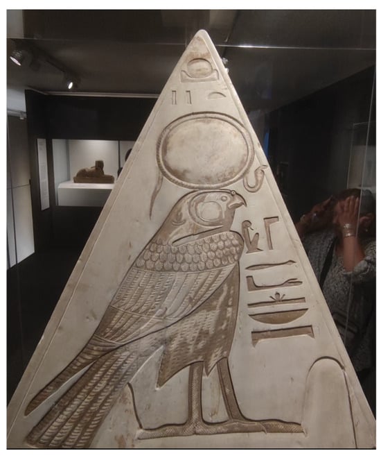 The representation of Ra-Haratki, Pyramidion of the scribe Ramose (Reign of Ramses II, Torino, Museo Egizio, item no. C. 1603). The cobra (uraeus) is present in the lower part of the solar disk (photo provided by the author).