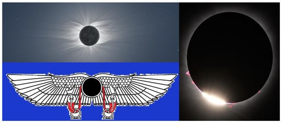 The hypothesis of identifying the wings with the solar corona during eclipses is not a novelty: other scholars did it in the past ().3 Several total eclipses have been observed in Egypt over the millennia of its history, but the eclipses were completely underreported in ancient Egypt, probably because they were considered as bad omens (). It is hypothesized that an eclipse influenced Amenothep IV to change his name and the capital city in Egypt in his 4th year of reign: this eclipse was total in the place where the new capital Akhetaten was created (). The identification of the uraei with the solar prominences visible during the totality is new. The Uraeus4 is the symbol of the goddess Wadget, a cobra who was considered as the patroness and protectress of Egypt. The colors and the representations of the figures of the solar disk (Figure 1, Figure 2 and Figure 3), in general, reflect symbolic models, possibly originating from a real observation made at first and then transmitted as an iconic tradition.