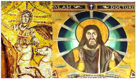 Christus Helios in the Mausoleo dei Giuli, Vatican necropolis (III century) on the left. The image of Christ in the triumphal arch in the Basilica of St. Paul outside the walls, Rome (IV century, rebuilt in XIX century) on the right side; photos by the author.