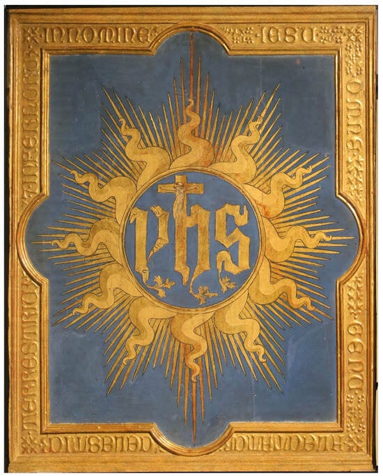 Table of the Christogram YHS. Made in 1424 and conserved in the Church of St. Francis in Prato. There are 12 main twisted rays, as the biblical number of the apostles, or the tribes of Israel. In the frame are the words (Philippians 2, 10)—In nomine Iesu omne genu flectatur, coelestium, terrestrium, et infernorum.