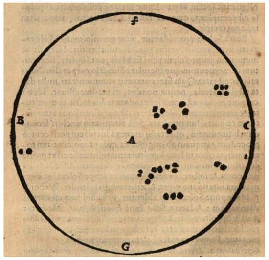 (), following the motion of the spots, interpreted them as located on the solar surface. Scheiner’s orbiting planet or cloud interpretation dates from 1611 (the Apelles letters). In the Rosa Ursina (), he actually gave up that notion and even determined the Sun’s rotational elements based on the spots, accepting that they belonged to the solar surface or were close to it. In the Borbonia Sidera (; see Figure 8), the spots were considered as moving stars.15 Jean Tarde (1561–1636) was a French prelate, historian and astronomer,16 who personally met Galileo in 1614.