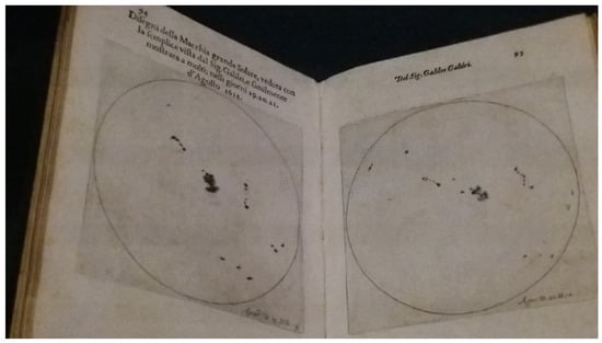 | 25 | Galileo, Istoria e dimostrazioni sopra le macchie solari (1613), at the exhibit La Città del Sole, 16 November 2023–11 February 2024, Palazzo Barberini, Roma. https://barberinicorsini.org/evento/la-citta-del-sole-arte-barocca-e-pensiero-scientifico-nella-roma-di-urbano-viii/ (accessed on 1 September 2025). The three letters of Galileo, combined in the Istoria are here () with all sunspots drawings. |