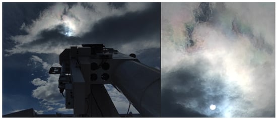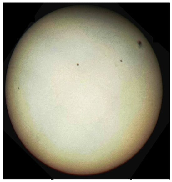 The eclipse in Figure 11 was visible to the naked eye at 15.2% of eclipse through that cloud. The Moon profile was 294″ inside the solar disk. A large sunspot has a lower contrast than the Moon’s profile on the Sun; the dimension of AR 4079 at its maximum reached about 150″ × 50″ including the penumbra (as in Figure 12 and Figure 13).