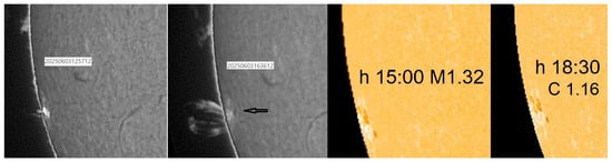 | 41 | This study has been conducted on C-class and M-class flares; in particular, M3 on 26 May and M9 on 25 May 2025 erupted from AR 4098 and M1.4 on 26 May from AR 4100, the same spot as AR4079, after half a solar rotation on the solar far side. In the aforementioned flares of May, there was not an optical counterpart visible in the camera obscura projection. The visible counterpart was seen with the M1.44 flare of 3 June 2025 13:03Z, observed clearly at M1 phase in camera obscura (Figure 16). The transient remained visible for 10 min, among the two spots of AR 4105, then fading to the normal facular level; the bright facula is visible also in the satellite SDO images of 13:00Z (M1.32), and the faded at 16:30Z (C1.16). |