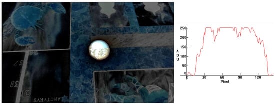 Pinhole image through a plane tree (Platanus Occidentalis). The limb darkening is mainly due to the opening of the accidental pinhole’s aperture, evaluated to about 58 mm, convoluted with the solar limb darkening. From the limb to the maximum luminosity, there are 24 pixels (370″) over a diameter of 123 pixels (300 mm, projected from about 30 m). Brightness profile obtained with IRIS software ().