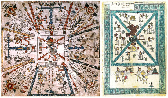 This interplay between inherited medieval frameworks and emergent modernity is especially apparent in urban design. The case of the City of Mexico—constructed atop the ruins of the Mexica capital, Mexico-Tenochtitlan—offers a particularly illuminating example. In this article, the term City of Mexico is preferred over Mexico City to reflect the historical and institutional context of the sixteenth-century urban foundation established by the Spanish following the conquest of Mexico-Tenochtitlan. This terminology corresponds with contemporary colonial usage and underscores the distinction between the early viceregal capital and the modern metropolis. Rather than representing a straightforward imposition of Castilian orthogonal planning onto a vacant landscape, the transformation of the viceregal capital entailed a complex and evolving negotiation between European urban ideals and indigenous spatial systems. The Mexica city was characterised by a meticulously organised and symbolically charged urban structure, aspects of which are vividly documented in Mesoamerican sources such as the Fejérváry-Mayer and Mendocino codices. These sources not only depict spatial configurations but also encode cosmological principles, social hierarchies, and politico-religious functions that continued to exert influence within the colonial urban context (Figure 1).