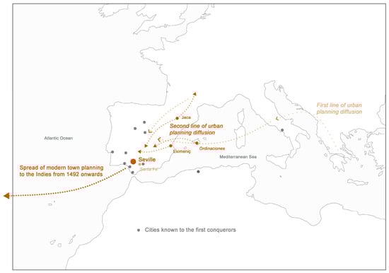 Spread of modern town planning: From the Iberian Peninsula, to Santo Domingo, Cuba, mainland, and New Spain or from America as well as the Iberian Peninsula? Source: The authors.