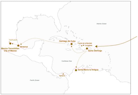 It is also important to note that the conquistadors and those tasked with founding the first cities in the newly acquired American territories were only familiar with urban centres still shaped by the medieval characteristics of the Iberian Peninsula. They had little or no exposure to the emerging urban innovations mentioned above. The list of such historical figures is extensive; however, by highlighting a few individuals and the cities they are known to have visited prior to their voyages to the Indies, this point may be clearly illustrated (Figure 7).