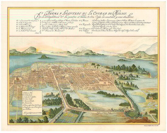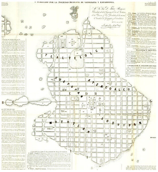 - Batres, Leopoldo. 1932. Plano de la ciudad de Tenochtitlan en le ano de 1519: Ensayo de reconstrucción formado por Leopoldo Batres inspector y conservador de los monumentos arqueológicos de la República Mexicana, y publicado por la Sociedad Mexicana de Geografía y Estadística. Available online: https://quod.lib.umich.edu/w/wcl1ic/x-8761/wcl008833 (accessed on 13 July 2024).