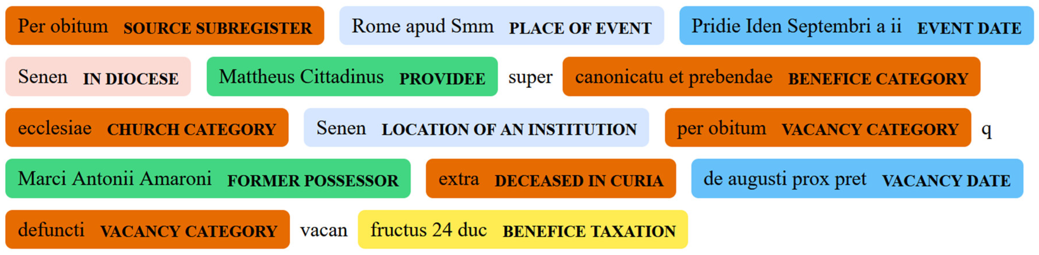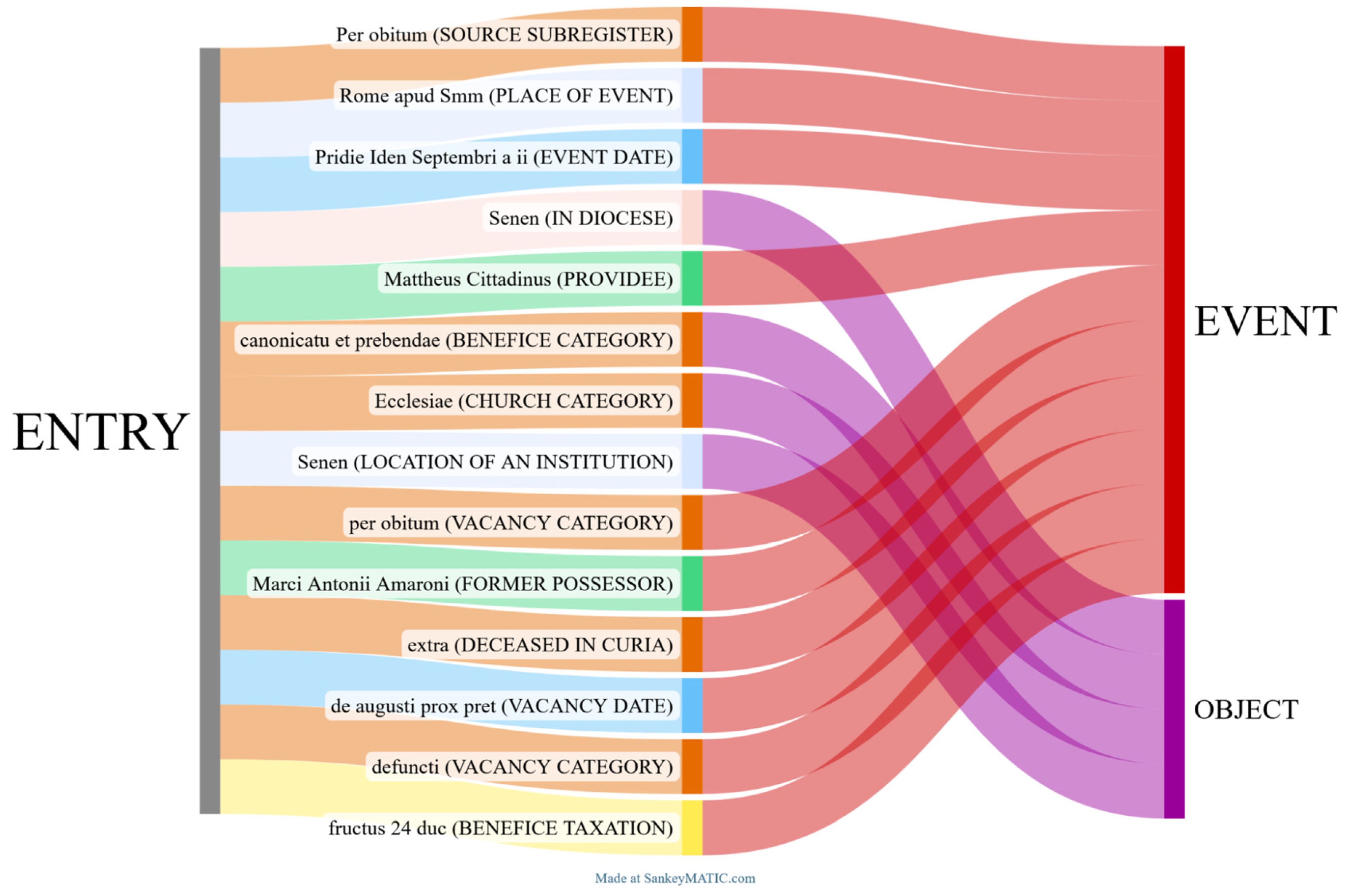 Put very simply, the Vatican Archive held Latin sources under scrutiny in the GRACEFUL17 project report on administrative processes within the Curia of the Roman Catholic Church (Landau 1980; Viana 2018; Balavoine 2011). Drawing on two samples (1622–23, 1677–78)4 and entailing roughly two thousand pages of densely written serial entries in the twenty thousands, each record (“entry”) testifies to the provision or dispensation of certain entitlements: most importantly, the allocation of vacant lower church offices such as rectorships. They encompass administration, governance, and bureaucracy for the entire Catholic world (including non-European territories), and were recorded by the so-called Apostolic Dataria in Rome, subject to the Pope’s authority (Fink and Mercati 1951; Pásztor 1970; Storti 1969). A typical entry of ca. 250 characters on average, for example, reports the death of a person holding a church office in a diocese and the provision of this church office to someone else, while indicating relevant dates, motivations, stakeholders, obligations, and legal circumstances. The underlying semantic model conceptualizes provisions as events and the offices provided as an (immaterial) objects (Sander and Boute 2025).5
