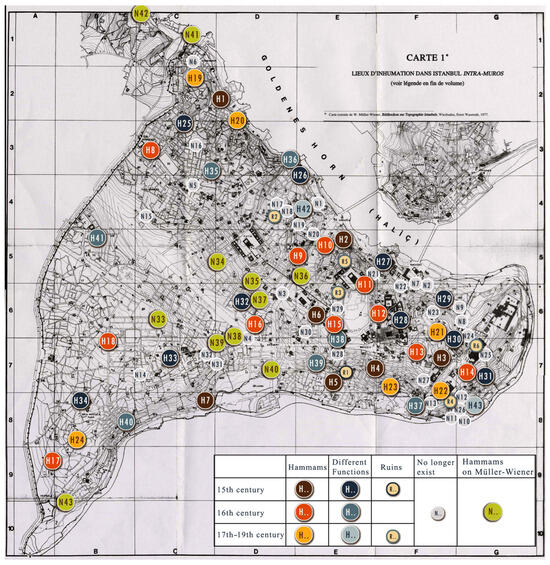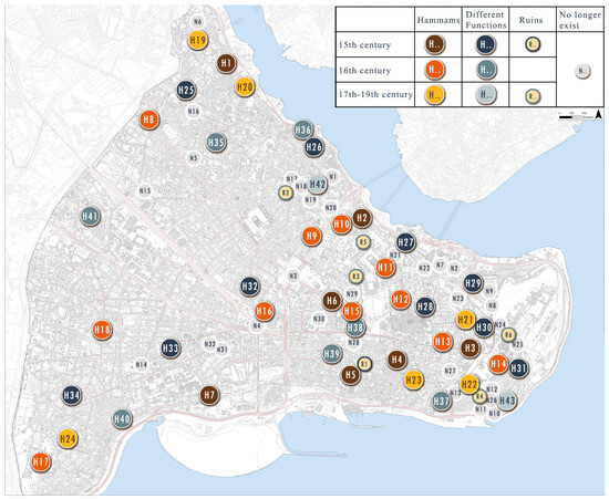 In the Historical Peninsula, there are ten registered hammams dating back to the 15th century (H26, H27, … H34), seven hammams dating back to the 16th century (H35, H36, … H41), and two hammams of unknown construction date (H42 and H43) (Table 2) that are currently used for different purposes or abandoned but still exist as buildings.