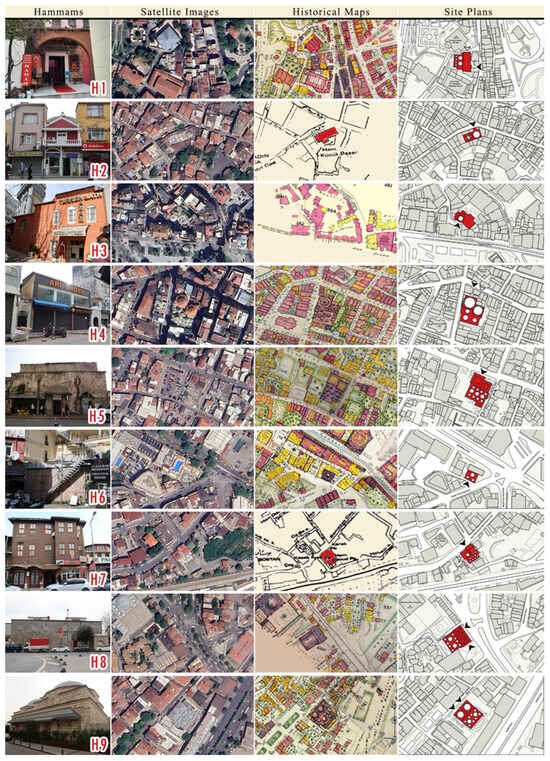 The main facade views, aerial photographs, locations on historical maps, and current locations (site plans) of hammams 1–9 (historical maps H1, H4–H6, H8–H9 [Pervititch]; H2, H7 [Ayverdi], H3 [Goad]; other documents created by the authors).