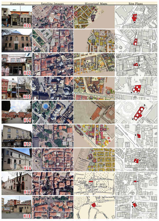 The main facade views, aerial photographs, locations on historical maps and current locations (site plans) of hammams 10–18 (historical maps H10–H13, H15–H16 [Pervititch]; H17–H18 [Ayverdi], H14 [Goad]; other documents created by the authors).