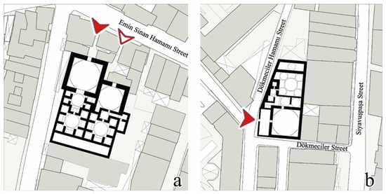 (a) Example of the double hammam typology: Gedikpaşa Hammam (H4), which has two separate entrances for women and men (the women’s entrance was later closed). (b) Example of the single hammam typology: Sultan Süleyman Hammam (H11) (drawn by the authors).