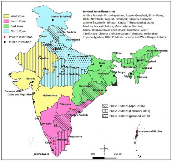 The surveillance network involved 19 tertiary care hospitals, including medical college hospitals (both public and private institutions) and private hospitals. Three to six hospitals, including at least one private-sector hospital, represented the four regions (north, south, east, and west) of India, considering the geography and sociocultural diversity. Rotavirus vaccines have been introduced in nine states of India until now, in two phases: four in phase 1 (since April 2016) and five in phase 2 (since February 2017). Ten network institutions are located in these states; four institutions in phase 1 and six institutions in phase 2 states (as reflected in Figure 1).