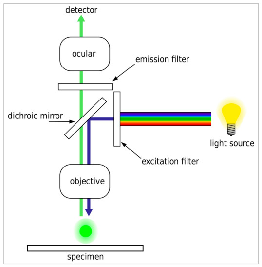 All slides were analyzed on an automated DM6000B widefield fluorescence microscope equipped with an eight-position filter turret, a 100 W high-pressure mercury vapor arc-discharge light source (Leica, Wetzlar, Germany) and an Orca R2 CCD camera (Hamamatsu, Tokyo, Japan). Images were recorded and analyzed using a 40×/0.75 Fluotar objective (Leica) and MicroManager 1.4 software (MicroManager, San Francisco, CA, USA). The filter sets used for each fluorophore and the optical set-up of the microscope are shown in Table 1 and Figure 1, respectively. The exposure time was set to 50 ms per fluorescence channel at a 1344 × 1024 pixel resolution. For the experimental set-up, we used spectral data in ASCII (American Standard Code for Information Interchange) format and the fluorescence spectra viewer, both from Chroma Technology Corporation (Bellows Falls, VT, USA) [11].
