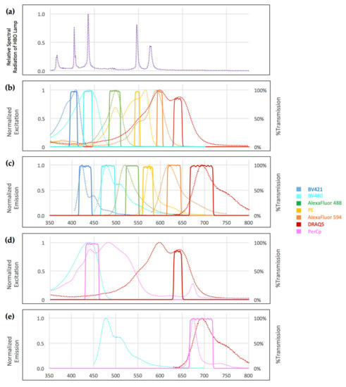 (a) Relative spectral radiation of the 100W high-pressure mercury vapor arc-discharge lamp (HBO lamp); (b–e) Normalized excitation and emission spectra for each fluorophore (dotted lines) and corresponding filter sets (solid lines) for seven-color widefield immunofluorescence microscopy; (b,c) Minimal overlap was achieved by positioning excitation filter sets at the foot of the descending slope of the preceding fluorophore and emission filters at the foot of ascending slope of the following fluorophore; (a,b) Mercury lamp radiation peaks at 405, 436, and 546 nm fully coincide with respective excitation filters; (d,e) Excitation of PerCp and DRAQ5 can be separated relying on the large stokes shift of PerCp while emission spectra overlap. ASCII data downloaded from Chroma Spectra Viewer [11].