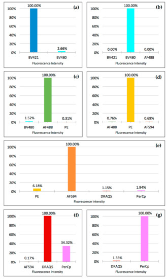 Crosstalk depicted for each fluorophore: Fluorescence intensity of each respective main channel is set to 100%. Crosstalk into adjacent channels is shown as percentage of fluorescence intensity of the main channel. (a) Brilliant Violet 421; (b) Brilliant Violet 480; (c) Alexa Fluor 488; (d) PE; (e) Alexa Fluor 594; (f) DRAQ5; and (g) PerCp. Cells were stained on separate slides for each fluorophore and data was acquired on a Leica DM6000B microscope with a 40× objective and 0.63× camera adapter using the 12-bit setting of a monochrome Hamamatsu Orca R2 digital camera. Integrated fluorescence density was determined after the subtraction of background fluorescence in each channel. Data are from at least six cells per channel. Standard deviation was minimal with error bars too small to show. Channels not shown did not exhibit detectable crosstalk.