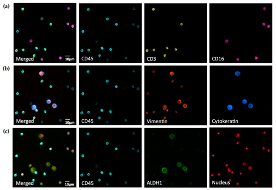 In human leukocytes and leukocyte sub-populations, up to five different signals were detected using anti-CD3 PE, anti-CD16 PerCp, anti-CD45 Brilliant Violet 480, anti-vimentin Alexa Fluor 594, and DRAQ5 nuclear dye. At the same time, cancer cells exhibited four different signals from staining with anti-cytokeratin Brilliant Violet 421, anti-ALDH1 AlexaFluor 488, anti-vimentin Alexa Fluor 594, and DRAQ5 nuclear dye.