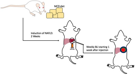 This protocol describes a preclinical mouse model of orthotopic HCC development in mice with underlying NAFLD by implantation of syngeneic HCC cell lines which can be monitored by BLI (Figure 1). This model can be used to study treatment strategies and also cell biology and immunology/immunotherapy in the setting of HCC with underlying NAFLD/NASH. The final readout can be achieved in a reasonable amount of time, within 4–5 weeks, after starting the experiment. For our purpose, we utilized the luciferase expressing HCC cell line RIL-175 [16]. Expression of the luciferase (LUC) gene in RIL-175 synthesizes the enzyme luciferase which allows for monitoring tumor progression during a course of treatment. This technique uses the detection of luminescence emitted after administration and oxidation of the substrate luciferin [17]. However, it has also been demonstrated that when tumors reach the end stage of disease, BLI may underestimate actual tumor burden although tumor growth may be progressing on other imaging modalities such as MRI [18,19]. We have also utilized this protocol with different HCC and non-HCC cell lines, such as the B16 melanoma cell line, with successful results.