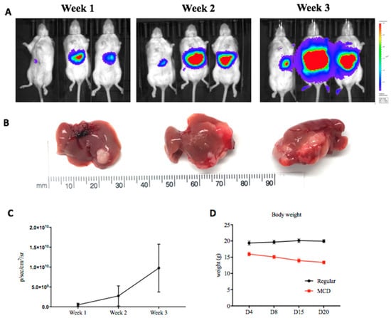 (A) IVIS imaging results after intrahepatic tumor injection. (B) Resulting tumors after the sacrifice of mice monitored by BLI. (C) Cumulative tumor growth was monitored by BLI and reported in photons/s/cm2/steradian (p/s/cm2/sr). (D) Change in the body weight of mice over the course of an experiment. Day 0 is when the intrahepatic tumor injection is performed. The MCD diet was initiated two weeks prior to the establishment of intrahepatic tumors.