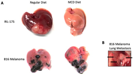 (A) Resulting RIL-175 HCC tumors and B16 melanoma tumors three weeks after intrahepatic injection in normal non-diseased (regular diet) and NAFLD (MCD diet) livers. (B) Lung metastasis were noted in mice injected with B16 melanoma cells (arrows).