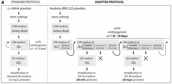 Compared to the model cv. 60444, Verdinha showed a significantly smaller percentage of SEs with torpedo structure, and this percentage was even smaller for the other Brazilian cultivars (Table S1). Therefore, we modified the protocol in order to increase the percentage of embryos at the torpedo stage (Figure 1). The torpedo SEs from Verdinha appeared after two cycles on CIM. We observed that shortening the multiplication time of SEs on CIM from 15 days to 8–10 days increased the ratio of torpedo-stage over cotyledonary-stage SEs (Figure 1b,c). At each SEs multiplication step, torpedo-stage SEs were transferred to GD medium for FEC induction. SEs showing cotyledonary-stage were discarded. As anticipated, the use of torpedo-stage SEs allowed a very low but reproducible FEC induction for Verdinha (BRS 222) (Table 1). The selection of potential FEC emerging from SEs on the first induction medium (GD #1) was particularly challenging, and as a general rule any globular putative FEC material was transferred to GD medium #2 (Figure 1d). Further replication of selected putative FEC on GD medium was used to confirm the embryogenic nature of the selected tissues (Figure S2a).