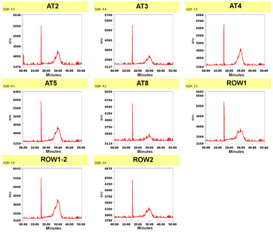 The methods described here were used for our previous DNA/RNA sequencing and shotgun proteomic analysis of microbiota associated with healthy oak trees and oak affected by Acute Oak Decline [,]. The quantities of extracted nucleic acid or protein were determined using the corresponding Qubit HS assay kit (Table 1). DNA was extracted using the Qiagen DNeasy Plant mini extraction kit, and where host-DNA depletion was required for microbiome analysis, the New England Biolabs NEBNext microbiome enrichment kit was applied. Fragment analyzer analysis of all DNA samples revealed DNA of sufficient quality for sequencing using five bark samples from symptomatic trees (AT5, AT8, ROW1, ROW1-2, and ROW2) and three bark tissue samples from non-symptomatic trees (AT2, AT3, and AT4) (Figure 1, Table 2).
