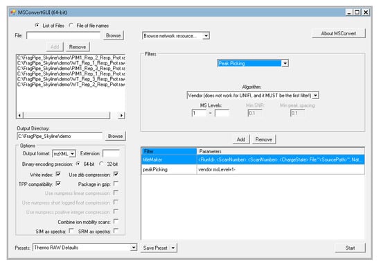 - In the options box below the output directory, adjust the settings to output format = “mzXML”, Binary encoding precision = “64-bit”, and check the boxes next to “write index”, “use zlib compression”, and “TPP compatibility”.