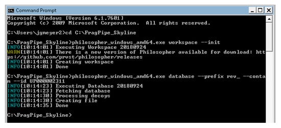 Figure 2. Initialize a philosopher workspace and automatically download and format a protein sequence database.philosopher_windows_amd64.exe workspace –initwhere the first command is the name of your philosopher executable. - Download your organism database and add contaminants and decoys by typing (Figure 2):philosopher_windows_amd64.exe database --prefix rev_ --contam --id UP000002311where the last text after “—id” is the uniprot identifier for your organism, which for the tutorial data is Saccharomyces cerevisiae (UP000002311). Do not close the command prompt. You will use this again in a subsequent step.