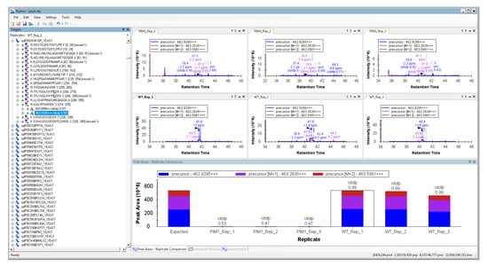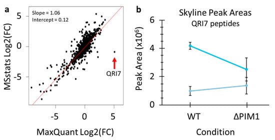 Finally, the results from the data analysis protocol presented here were directly compared with the quantitative results reported by the previous publication of this data where analysis was done using MaxQuant [5]. Skyline quantification and MSstats significance testing were repeated using settings that more closely mimic those used in the previous publication of this data (5 ppm precursor accuracy, 1-minute XIC windows, MSstats analysis without normalization of medians) [20]. The comparison of the quantification produced by these two workflows revealed overall very good agreement (Figure 7a). However, this comparison did reveal one clear outlier protein that was greatly increased according to MaxQuant, but unchanged according to MSstats—QRI7. Highlighting the value of the data analysis workflow presented here, Skyline enabled quick and easy inspection of this protein’s raw quantification data using the find function in Windows (control+F). Skyline quantification of two peptides from QRI7 showed no obvious difference in this protein between the WT and PIM1 knockout groups (Figure 7b). According to a re-analysis of the same data using MaxQuant, the same two peptides were found using both workflows, but manual inspection of the raw data was not easily performed. There are several possible reasons for this discrepancy, such as the wrong peptide peak was integrated, or the peak was only integrated into some samples and assigned intensities of zeros in others. Therefore, in the case of this outlier, we were able to quickly validate that the QRI7 protein is not altered between the compared conditions.