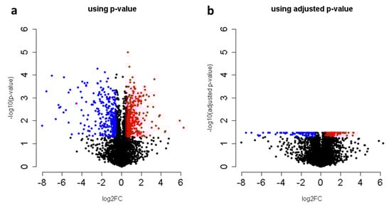 Volcano plots from the tutorial data results comparing the proteome of ΔPIM1/WT using MSstats output with either (a) the p-value or (b) the adjusted p-value. Red indicates an increase, and blue indicates a decrease at a cutoff of at least 1.5-fold and a p-value or adjusted p-value cutoff < 0.05.