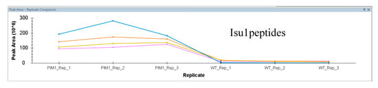 Peptide areas measured by Skyline for the protein Isu1 showing a concerted increase in the PIM1 knockout.