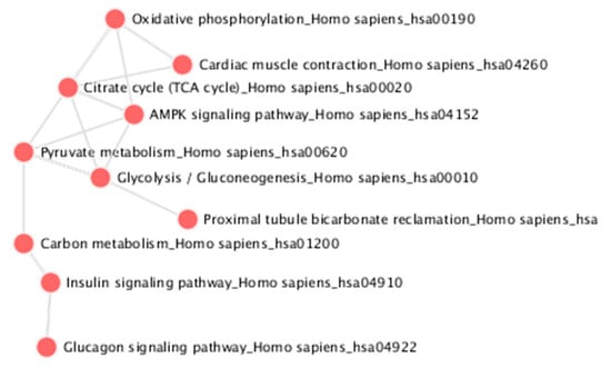 The KEGG Pathway enrichment analysis of the 74 proteins that decreased at least 2-fold in PIM1 KO yeast (adjusted p-value < 0.05).