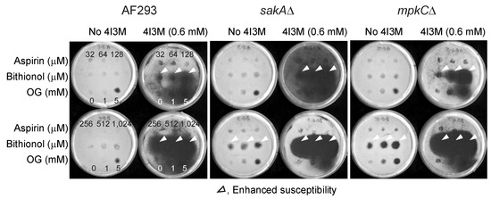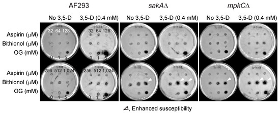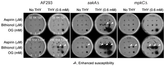 Results showed that antifungal activity of bithionol was greatly enhanced by thymol, while that of aspirin was almost not affected, indicating “drug-chemosensitizer specificity” exists for the enhancement of antifungal activity (Figure 2). Drugs were tested at 32 to 1024 μM, with or without 0.6 mM of thymol, and the positive control OG was tested at 1 and 5 mM. The results also showed that A. fumigatus MAPK mutants (sakAΔ, mpkCΔ) were more susceptible to the treatment compared to the wild type, indicating increased susceptibility of antioxidant mutants to the co-application of redox-active agents, such as thymol.