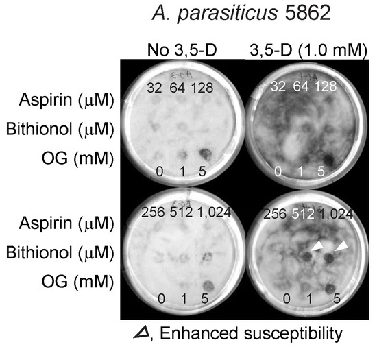 Similar results were obtained in the aflatoxin-producing A. parasiticus, where the sizes of zone of inhibition were generally smaller than that observed in A. fumigatus. Therefore, results indicated that “strain-specificity” also existed for the enhancement of the efficacy of “bithionol and 3,5-dimethoxybenzaldehyde” co-treatment in different Aspergillus species (Figure 6).