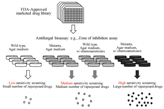 Considering the development of entirely new antifungal drugs is a capital-intensive and time-consuming process, an alternative approach termed “antifungal drug repurposing” has been recently investigated. Antifungal drug repurposing is the repositioning process of already marketed non-antifungal drugs—previously approved for treating other diseases—to control fungal infections [14]. One of the merits of drug repurposing is that the mechanisms of action, cellular targets or safety of the commercial drug has already been identified or characterized. However, although drug repurposing has become a viable approach to accelerate new antifungal drug development, this strategy still requires highly sensitive screening systems.