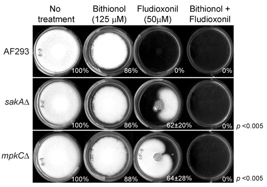 Fludioxonil (phenylpyrrole) is a commercial antifungal agent, which induces abnormal and excessive stimulation of the oxidative stress MAPK signaling system [77]. However, fungi having mutations in oxidative stress MAPK pathway can escape the fludioxonil toxicity [77]. As shown in Figure 8, two MAPK mutants (sakAΔ, mpkCΔ) of A. fumigatus exhibited tolerance to fludioxonil at 50 μM, and developed radial growth on PDA, while the growth of the wild type was completely disrupted. However, co-application of sub-fungicidal concentration of bithionol with fludioxonil effectively prevented fungal tolerance to fludioxonil, therefore achieving complete inhibition of the growth of two MAPK mutants. The Student’s t-test for paired data (combined, i.e., bithionol + fludioxonil) was versus bithionol alone or fludioxonil alone and determined in sakAΔ and mpkCΔ strains, where the p values for “combined” were determined as <0.005 for both versus bithionol only and fludioxonil only.
