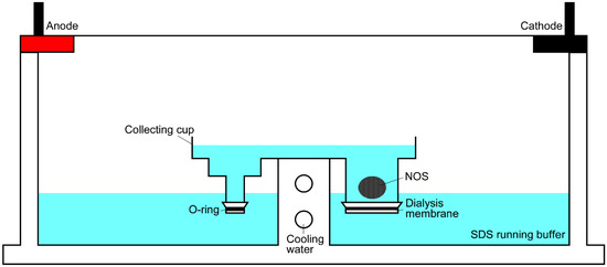 Proteins were extracted from the NOS using a NA-1710 protein recovery apparatus (Nihon Eido Co., Tokyo, Japan), which is usually used to electro-extract excised protein bands from SDS-PAGE gels. Dialysis membranes were attached to the bottom of the anode and cathode chambers of a sample cup using plastic O-rings to prevent any leakage of extracted proteins (Figure 1). The NOS (30 mg) was placed on the bottom of the cathode chamber and the sample cup and electrophoresis tank were filled with SDS running buffer (25 mM Tris, 192 mM glycine, and 0.1% SDS). Electroextraction was carried out for 3 h at 100 V. The apparatus is able to be cooled by running water throughout the electroextraction when necessary. However, the electroextraction chamber was not cooled in this study. Following the electroextraction process, the buffer in the anode cup was gently removed from the top of the chamber to approximately 1 cm from the bottom of the anode cup. This was performed using a pipette to prevent any buffer disturbances in the cup. The electro-extracted proteins (EEPs) were then carefully collected from the bottom of the anode cup to prevent puncturing of the dialysis membrane. The EEPs were dialyzed overnight against Milli-Q water, freeze-dried, and then resuspended in 200 µL of Milli-Q water.