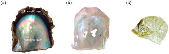 From left to right: The Japanese pearl oyster (Pinctada fucata) shell, the nacreous layer and the nacreous organic sheet. (a) Inner side of a shell. (b) The exposed iridescent nacreous layer following mechanical removal of the prismatic layer. (c) The nacreous organic sheet (NOS) was obtained following an ethylenediamine-N,N,N′,N′-tetraacetic acid (EDTA)-mediated decalcification step to remove the nacreous layer.